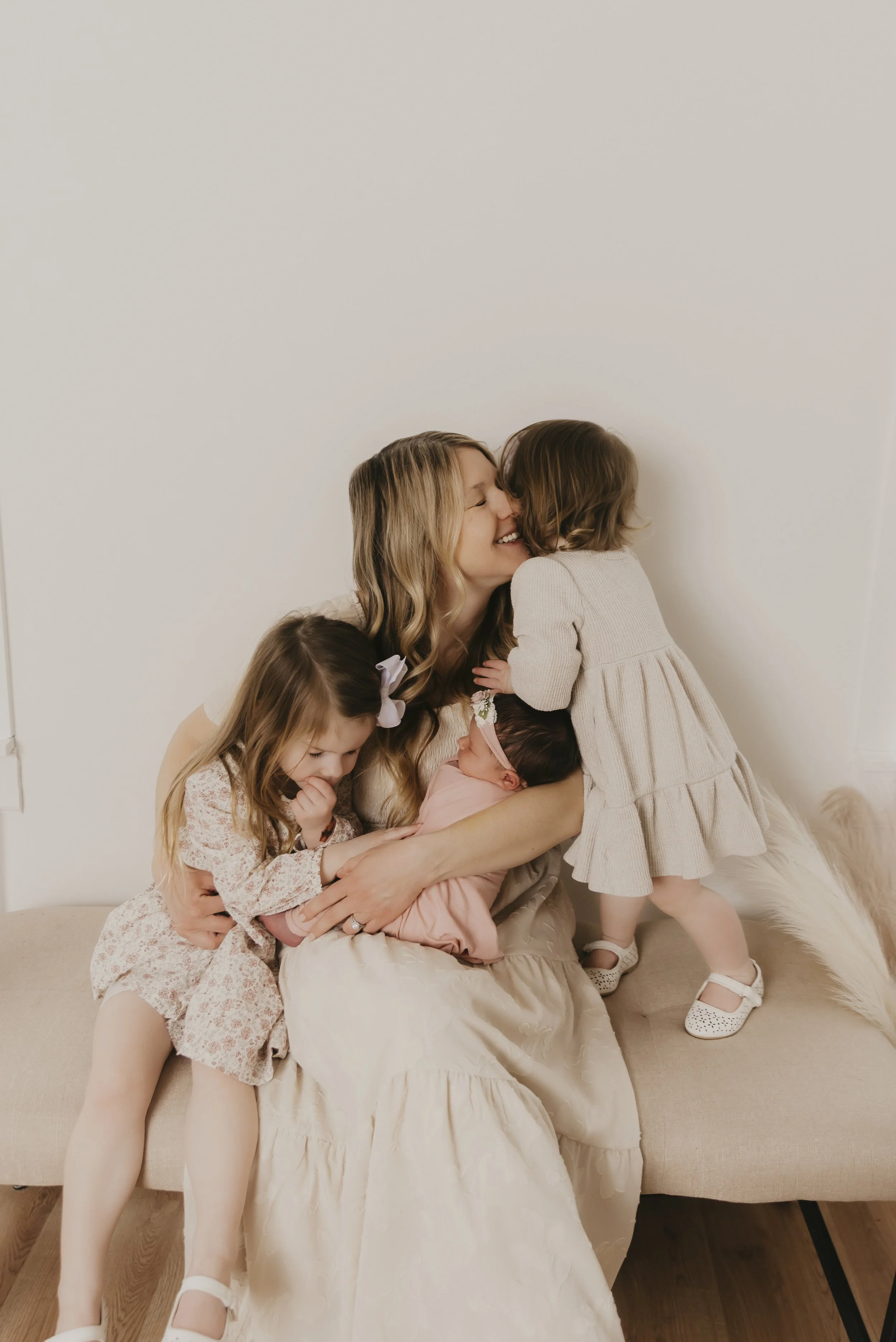 Studio sessions take place in a bright, neutral space designed specifically for newborns and families.