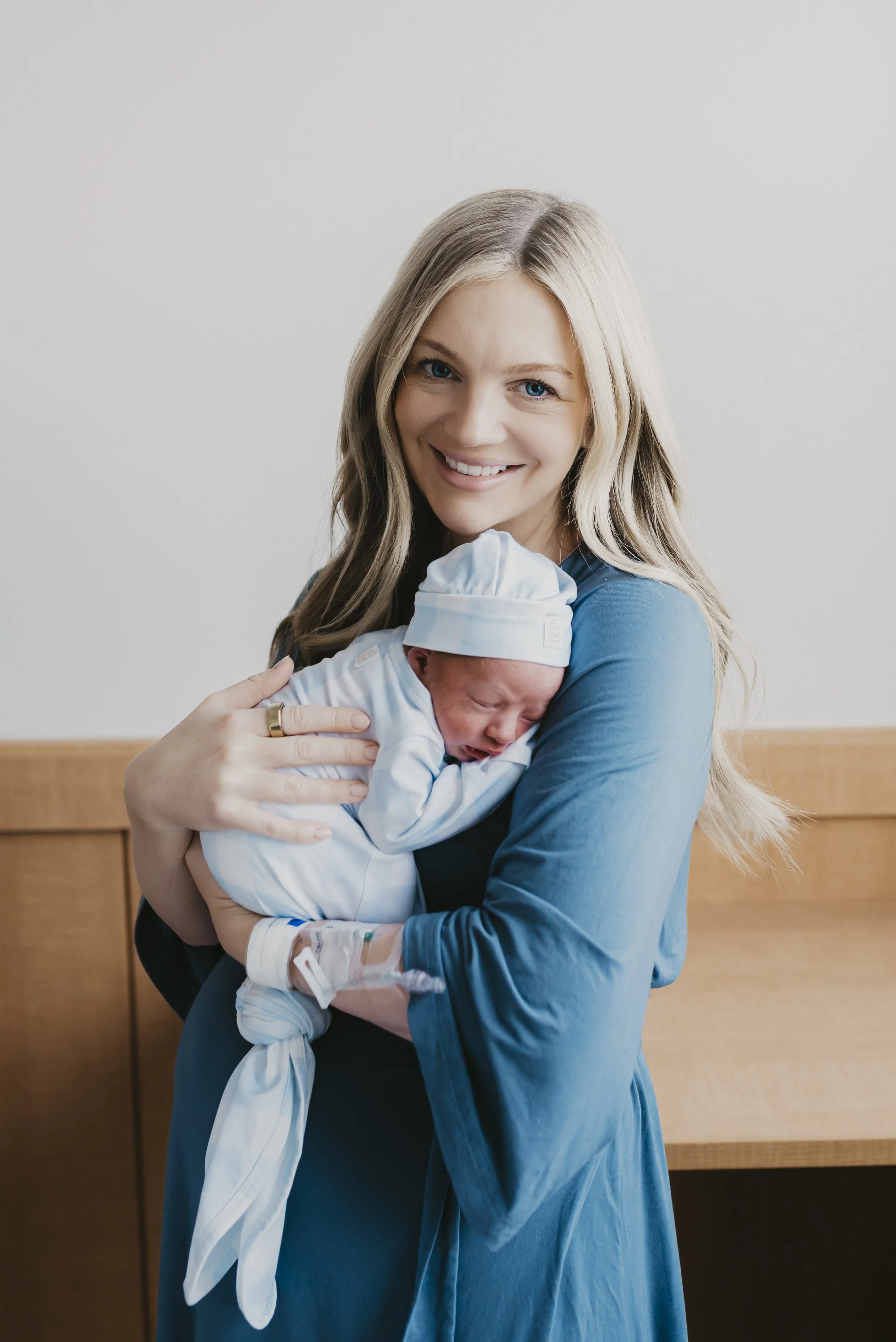 For moms, flowy dresses, cozy knit sweaters, or simple fitted outfits work especially well. For babies, I recommend a simple swaddle, neutral sleeper, or minimal outfit.